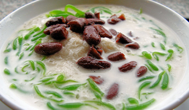 На первый взгляд это блюдо похоже на обычную лапшу с бобами и бульоном, правда, почему-то зеленого цвета. На самом деле рисовая желеобразная лапша — сладкая, бульон оказывается кокосовым молоком, а бобы изготовлены из шоколада. Иногда можно встретить вариации с добавлением мороженого или дуриана.