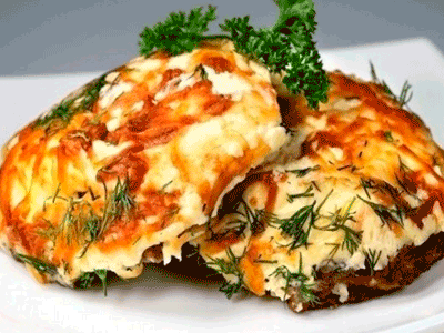 - Запеченное мясо с грибами и сыром