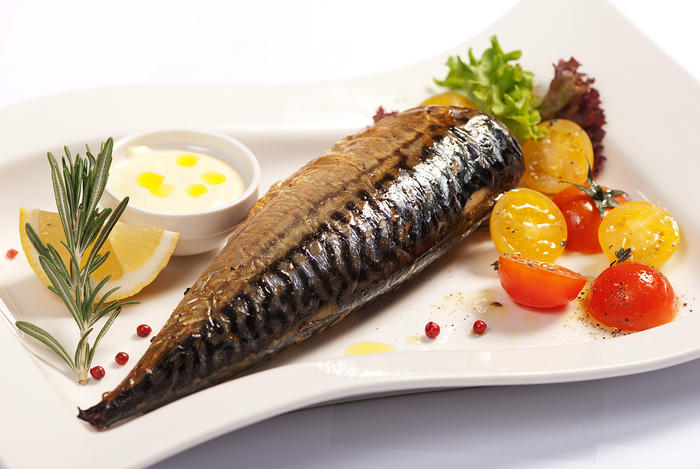 Скумбрию выпотрошите, удалите жабры и глаза. Замаринуйте рыбу солью, перцем и лимонным соком на 20-30 минут. Обжарьте на гриле с двух сторон в течение 25 минут, сбрызните долькой лимона. Пшеничных хлеб обжарьте на гриле, поливая чесночным соусом. Подавайте готовую рыбу с чесночным хлебом и соусом тартар, украсив дольками лимона, листьями салата и зеленью петрушки. Тартар состоит из майонеза, белого сухого вина, нарезанного репчатого лука, соленых огурцов, соли, перца и отварного нарезанного яйца. Чесночный соус состоит из чеснока, воды, укропа, соли, перца и растительного масла.