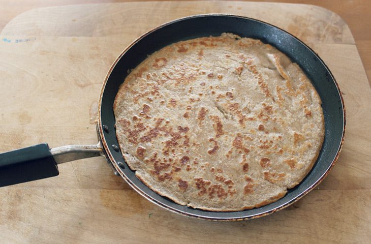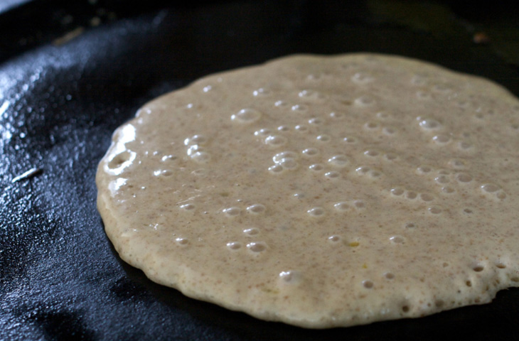 Блины переворачивают один раз, сразу после того, как одна сторона поджарилась до золотистого цвета. В какой именно момент нужно перевернуть блин подскажет еще сырая сторона. На ней должны образоваться пузырьки. Как только эти пузырьки полопаются и поверхность покроется «порами» — блин пора переворачивать. Для этого блин необходимо поддеть с краев лопаткой, отделив от сковороды, после чего подсунуть лопатку под середину и быстро перевернуть.