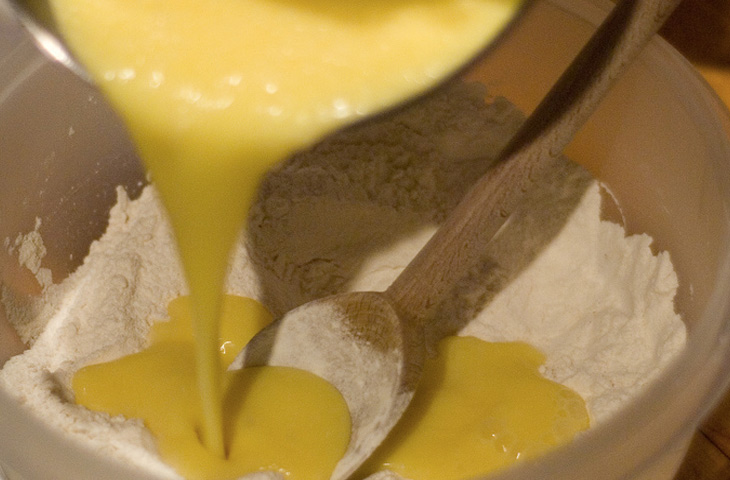 Никому не нравятся оставшиеся в тесте мучные комочки. Чтобы они не образовались, муку добавляют постепенно и тщательно мешают тесто для получения однородной массы. На этом этапе важно не переусердствовать. Наша цель — гладкая текстура, поэтому мешать тесто надо лишь до тех пор, пока влажные и сухие ингредиенты не смешаются между собой. Если чересчур увлечься процессом, от механического воздействия клейковина муки начнет разрушаться, что сделает тесто излишне жидким и липким.