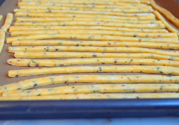 Нарезаем соломкой и выкладываем на противень, застеленный пергаментом.