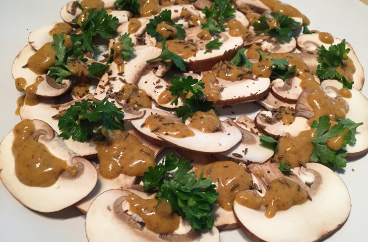 Тщательно вымойте грибы, удалите сомнительные места и тонко нарежьте острым ножом. Смешайте миндальное и оливковое масло, бальзамический уксус, кленовый сироп и специи в миске. Если смесь получается недостаточно жидкой, добавить немного теплой воды. Ломтики грибов выложите на тарелке, полейте соусом и посыпьте петрушкой. Можно посыпать карпаччо семенами тмина — они дадут интересный вкусовой оттенок.