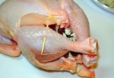 Вымытого и обсушенного цыплёнка начините рисом с изюмом.