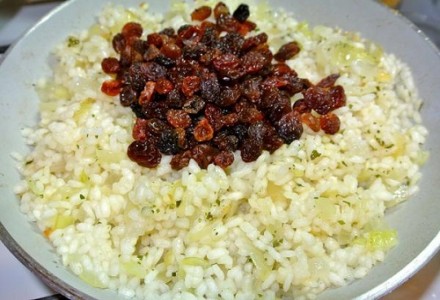 Затем снимите рис с огня, сразу же всыпьте промытый изюм и перемешайте.