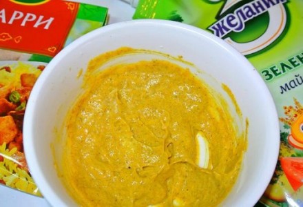 Чтобы приготовить соус для цыплёнка, соедините карри и майонез, хорошо перемешайте.