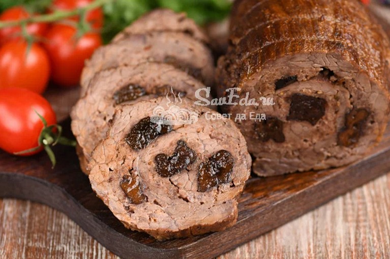 Чернослив промойте и распределите на фарше на небольшом расстоянии друг от друга. Закрутите мясо в рулет и свяжите ниткой. Уложите рулет в мешок для запекания.