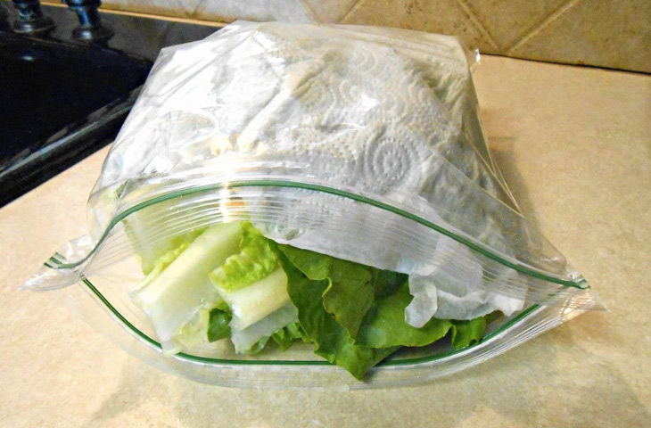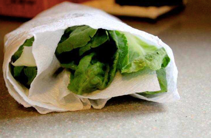 Один из самых популярных способов хранения салатной зелени — завернуть вымытые и высушенные листья в бумажные полотенца и убрать их в закрывающийся полиэтиленовый пакет. Считается, что бумажные полотенца поглощают избыток влаги из зелени, что препятствует образованию на ее поверхности слизи, а запечатанный пакет замедляет процесс увядания. Прежде чем запечатать пакет и убрать его в холодильник, из него нужно выдавить как можно больше воздуха.