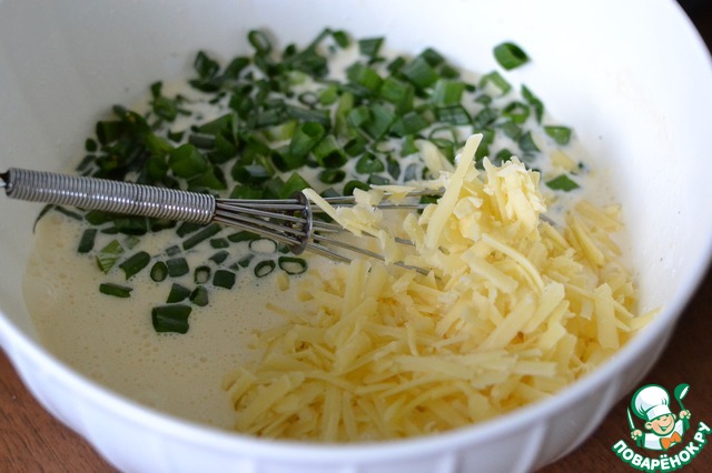 В отдельной миске смешать сметану, сливки, яйца, перец, натертый твердый сыр и мелко нарезанный зеленый лук.