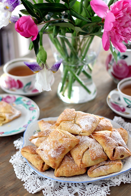 Тесто тонко раскатать и нарезать квадратами примерно 10*10 см.