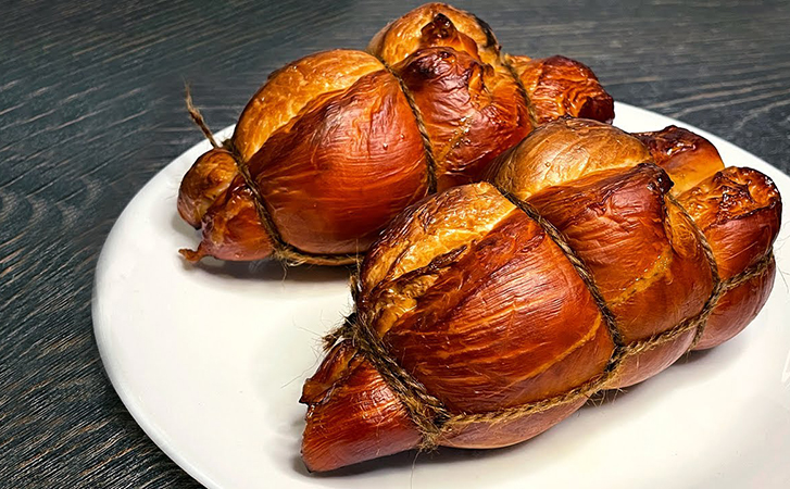 Приготовление: Вскипятите воду, растворите в ней соль и сахар, остудите рассол. Погрузите куриные грудки так, чтобы они были полностью покрыты жидкостью. Уберите ёмкость в холодильник на трое суток, каждый день переворачивая мясо, чтобы оно просолилось равномерно. Через 72 часа достаньте грудки, промойте холодной водой, обсушите бумажными полотенцами и оставьте на воздухе, чтобы на поверхности образовалась сухая пленка. Соедините грудки попарно и перевяжите бечёвкой.