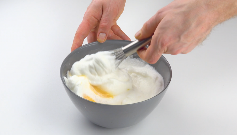 2.) Белки взбиваем с оставшейся сахарной пудрой, пока масса не станет плотной и воздушной. После этого смешиваем 2 части теста вместе. Хорошенько перемешиваем.
