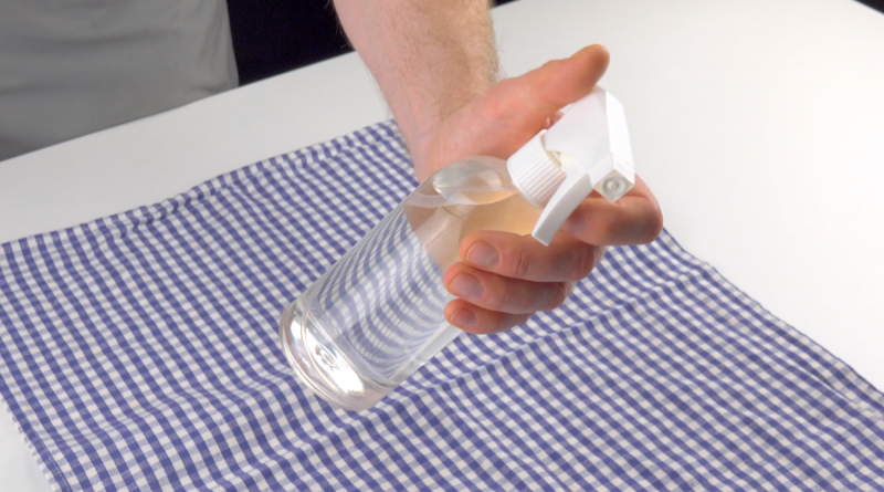 4.) Когда бисквит готов, берем чистое полотенце и смачиваем чистой водой. Выкладываем бисквит на полотенце, снимаем бумагу с теста и с помощью полотенца переворачиваем корж на другую сторону.