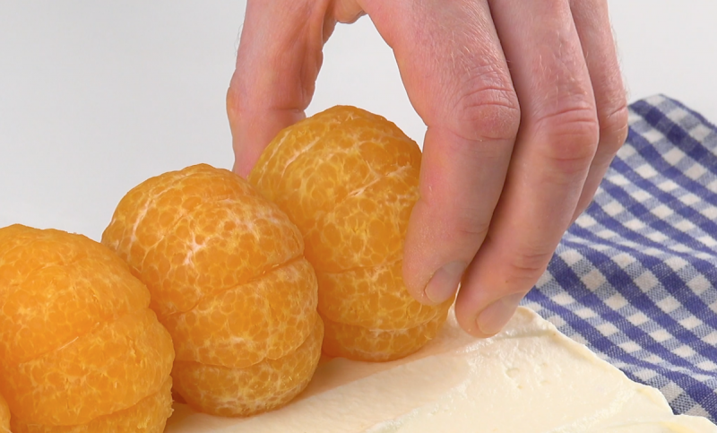 5.) Для крема смешиваем йогурт с ванилью, добавляем разбавленный в воде желатин. Взбиваем сливки и также добавляем в смесь. Полностью покрываем кремом бисквитный корж. Затем вдоль короткого края коржа вплотную друг к другу кладем мандарины. Наконец, аккуратно сворачиваем тесто в рулет, чтобы мандарины оказались внутри.