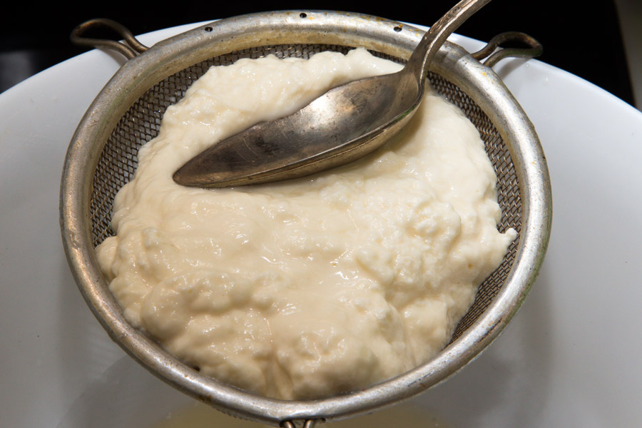 Сыр в сите приминаем ложкой так, чтобы из него вышла лишняя жидкость.