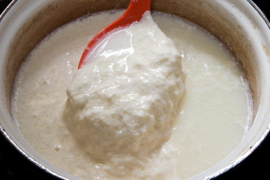 Продолжаем нагревать и помешивать молоко. Когда температура молока будет градусов 35, выливаем в него раствор ацедин-пепсина и продолжаем мешать. Молоко свернется в большой липкий комок (мой любимый момент-очень интересно наблюдать ;))) )