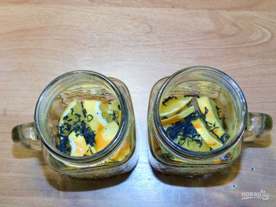 Добавьте нарезанные апельсины и немного чайной заварки. Залейте все кипятком и накройте крышкой. Оставьте завариться минут на 5.