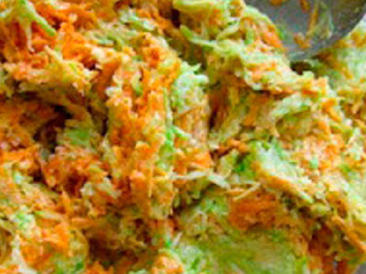 То же проделать с морковкой. То есть морковь нужно почистить, помыть и натереть на мелкой терке. Отжать морковь от сока. Объем моркови, отжатой от сока, должен составить один стакан.