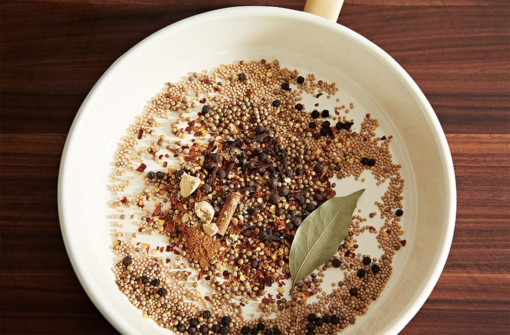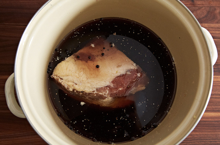 Достать мясо из рассола, промыть, обсушить и выложить на большую тарелку. В мельнице для специй измельчить оставшийся перец горошком, кориандр, семена горчицы и фенхеля. Переложить специи в маленькую миску и хорошо перемешать. Натереть смесью грудинку, полить сверху соусом shiro dashi — он даст копченый аромат. Тарелку накрыть и поставить в холодильник приблизительно на 12 часов.
