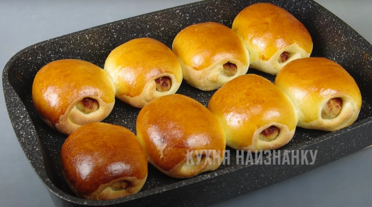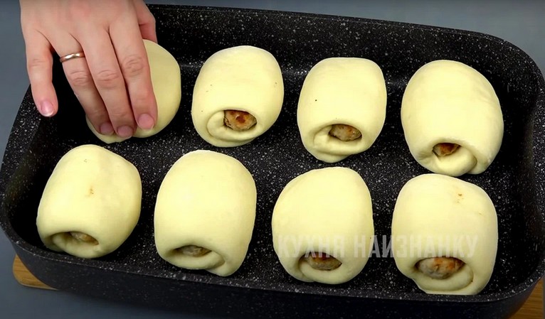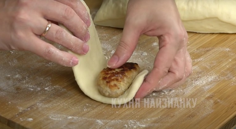 Тесто хорошо вымешайте. Разделите на части, каждую раскатайте в небольшой пласт. Внутрь вложите котлетку.