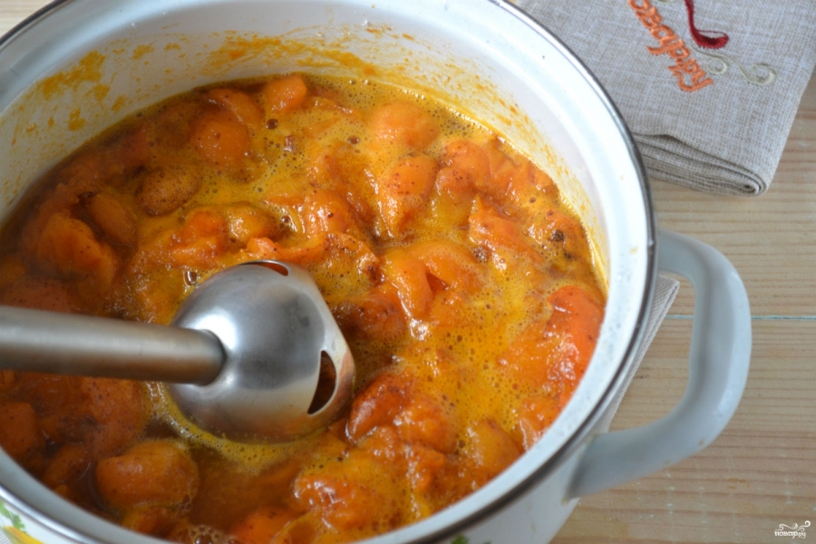 Поставьте кастрюлю с абрикосами на огонь и варите после закипания 20 минут. Обязательно часто помешивайте, чтобы абрикосы не пригорели, а повидло не потемнело. Затем измельчите содержимое кастрюли с помощью погружного блендера в однородную кремообразную массу.