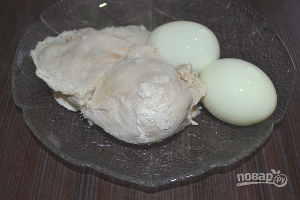 1. Первым делом подготовьте все ингредиенты. Филе отправьте в кастрюльку с водой и отварите до мягкости. Яйца сварите вкрутую.