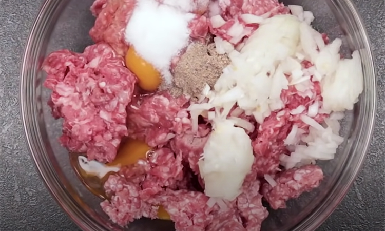 В фарш добавляем измельченный лук, специи, яйца, замоченный в молоке хлеб и все это перемешиваем.