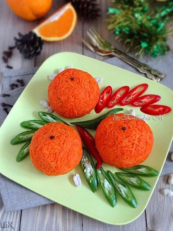 Морковь натереть на мелкой терке. К рису добавить размятую вилкой форель, тертую мякоть яблока, сыр, мелко рубленый чеснок, орехи. Подсолить по вкусу, заправить салат майонезом. Для гигиеничности и удобства надеть целлофановые перчатки, руки смочить водой и сформировать из салата одинаковые шары, размером с апельсин. Каждый шар облепить морковью без пробелов, выровнять. Выложить «апельсины» на блюдо, имитируя «попку», воткнуть по гвоздичке.