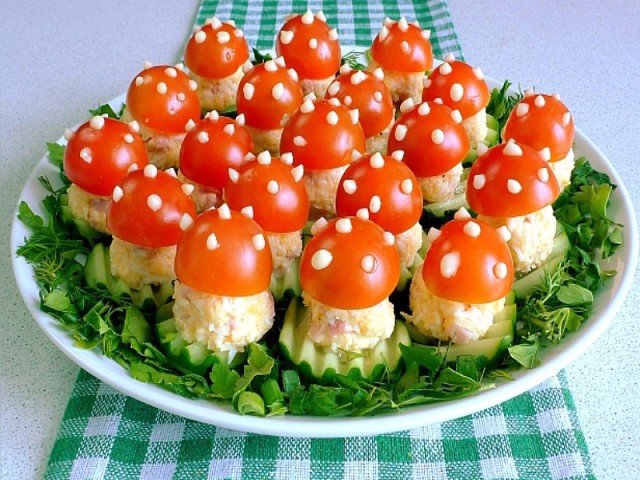 Из смеси яиц, сыра и ветчины формируем небольшие шарики. Если такой шарик приплюснуть сверху и снизу, то получится бочонок, который будет служить ножкой гриба. Усаживаем получившиеся ножки на огурчики. Сверху одеваем красные шляпки из половинок помидоров черри. Чтобы придать уже красивой закуске законченный вид, осталось лишь на красных шляпках нарисовать белые точки из майонеза. Удобнее всего это сделать обычной зубочисткой. Следует лишь учитывать, что эту закуску желательно готовить непосредственно перед приходом гостей (максимум за час), так как огурцы и помидоры могут дать сок.