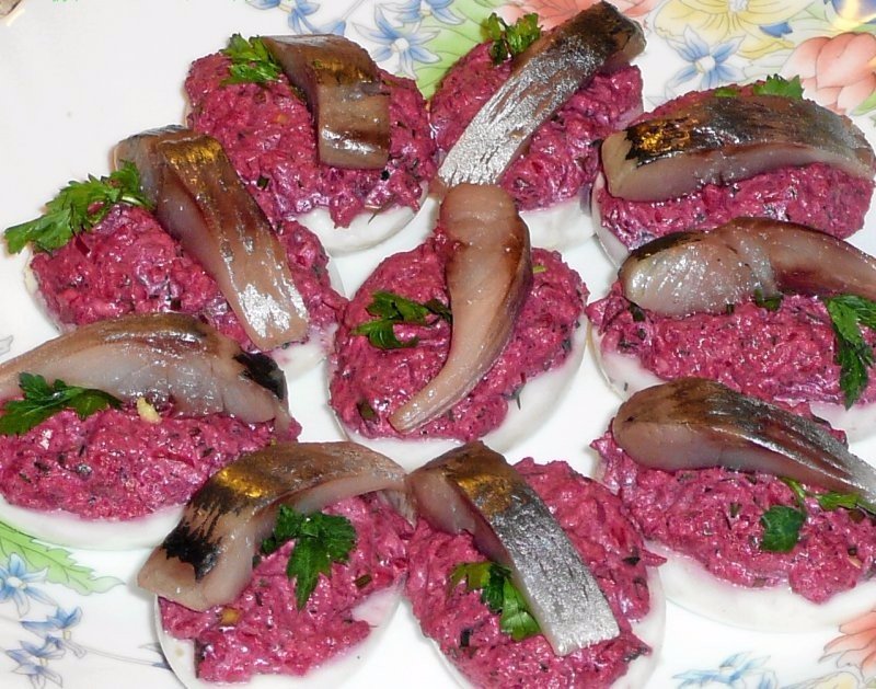 4. Нафаршировать полученной массой корзинки из половинок яичного белка, ленивая шуба готова.