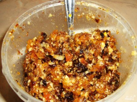 - Шаг 3 Сухофрукты, лимон, орехи измельчаем с помощью мясорубки или блендера до однородной массы.
