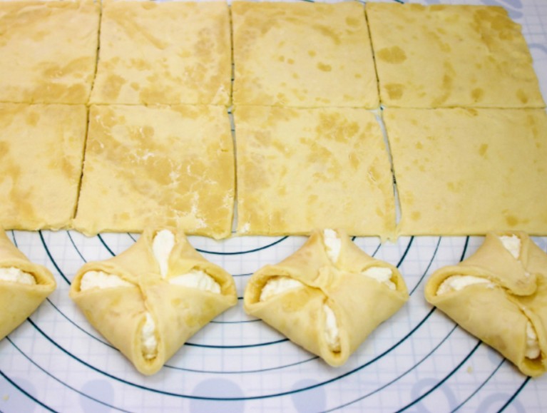 В чаше соедините ингредиенты для начинки и хорошо перетрите вилкой. На каждый подготовленный квадрат выложите по 1-2 ст.л. начинки и заверните как показано на фотографии ниже.