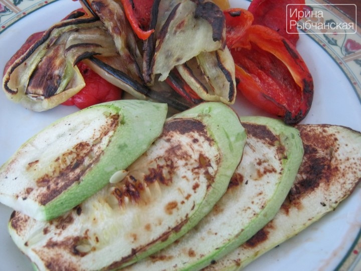 - Испечь овощи на мангале, все среднего размера, очистить их окуная руки в воду.
