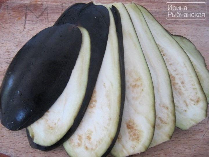 - Баклажаны вымыть, удалить «хвостики», нарезать вдоль на довольно толстые куски (5-6 мм).