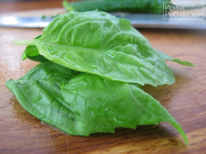 - Измельчить зелень (у меня — зеленый базилик, но лучше фиолетовый, а так же кинза).