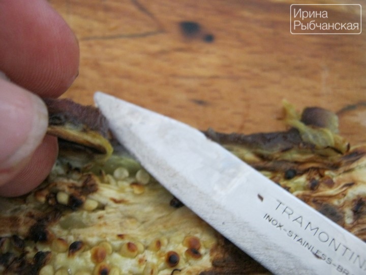 - С баклажанов необходимо снять жесткую шкурку ножом.