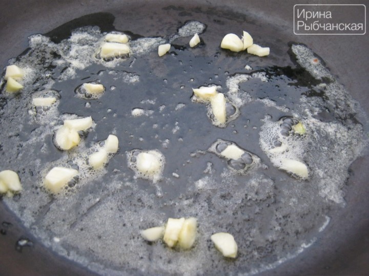 - Чеснок почистить, крупно нарезать, слегка обжарить на оливковом масле до прозрачности.