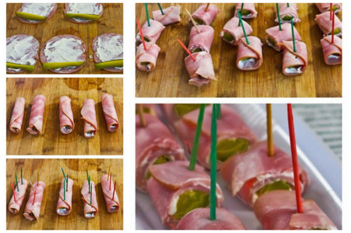 Если под рукой нет даже колбасы, сделать рулетики можно из тонких слайсов овощей.