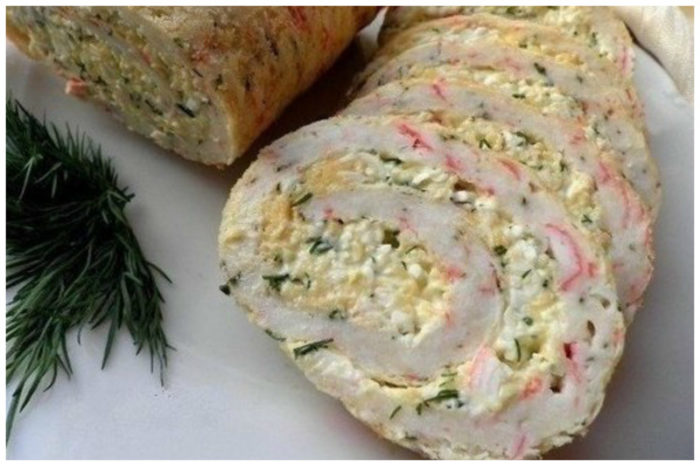 4. В готовую массу положите начинку (самые вкусные начинки — сыр с чесночком и фарш с измельченной зеленью) и сверните в рулет. При подаче порежьте небольшими слайсами.