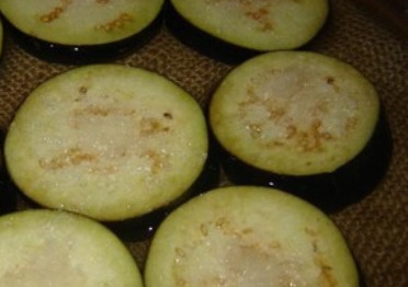 - Баклажаны нарезаем кружочками, солим и заливаем кипятком на 10 минут. Помидоры нарезаем кружочками, чеснок пропускаем через чеснокодавилку.